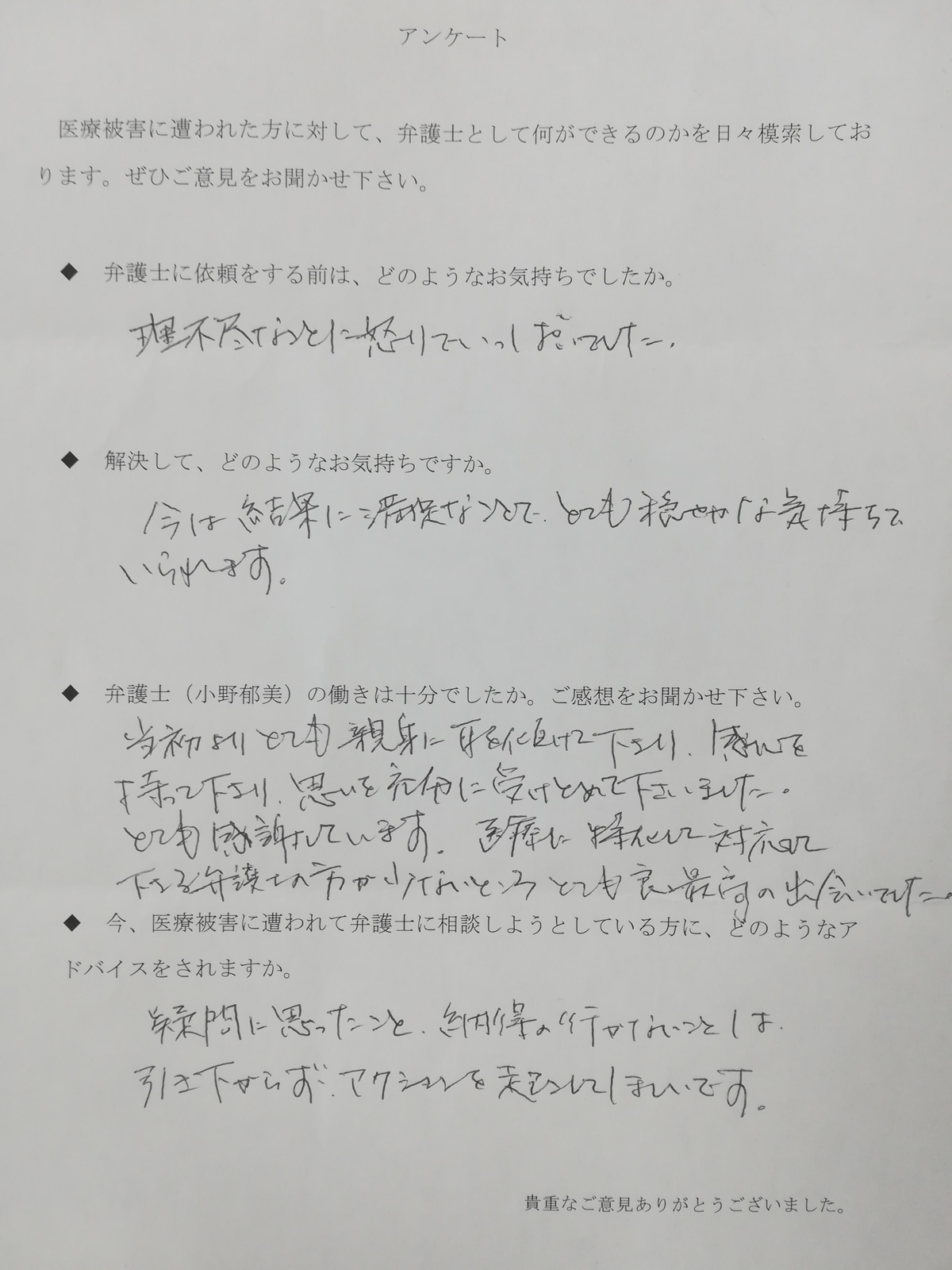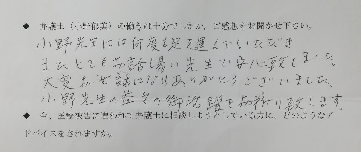 十分でした。小野弁護士と内弁護士は本当に私の味方でいてくれました。医療事故に対する訴訟等の実情、いろいろ助言していただいたことで、私が望む解決へ導いてもらったと思っています。お二人には本当に感謝しています。ありがとうございました。